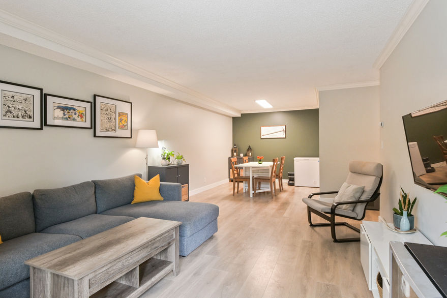 Lifestyle living at its finest! Located in a tranquil, tree-lined setting beside a park, this unique ground-level unit offers rare, extended patio area with private access—perfect for pet owners or outdoor enthusiasts. Beautifully renovated 2 bed, 1 bath condo with premium stainless steel appliances, granite countertops, new laminate flooring, fresh paint, and upgraded lighting throughout. Walk to all levels of schools, groceries, shops, restaurants, breweries, and the beach. Cyclist- & walker-friendly, with an endless network of trails and green space all around. Cut your laundry time in half with dual loads in multiple smart machines, conveniently located on the same floor. Includes 1 parking stall & 1 storage locker; extra stalls available for $10/month.